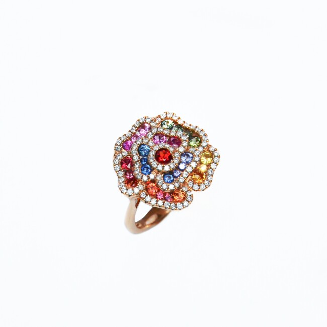 Bague Rullière Bernard "Fleur rainbow" en or rose, diamants et multi saphirs